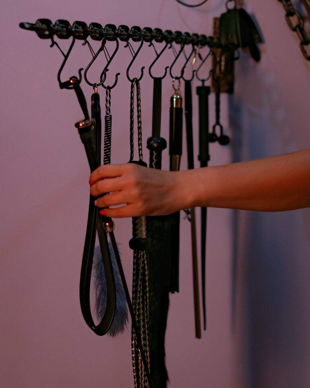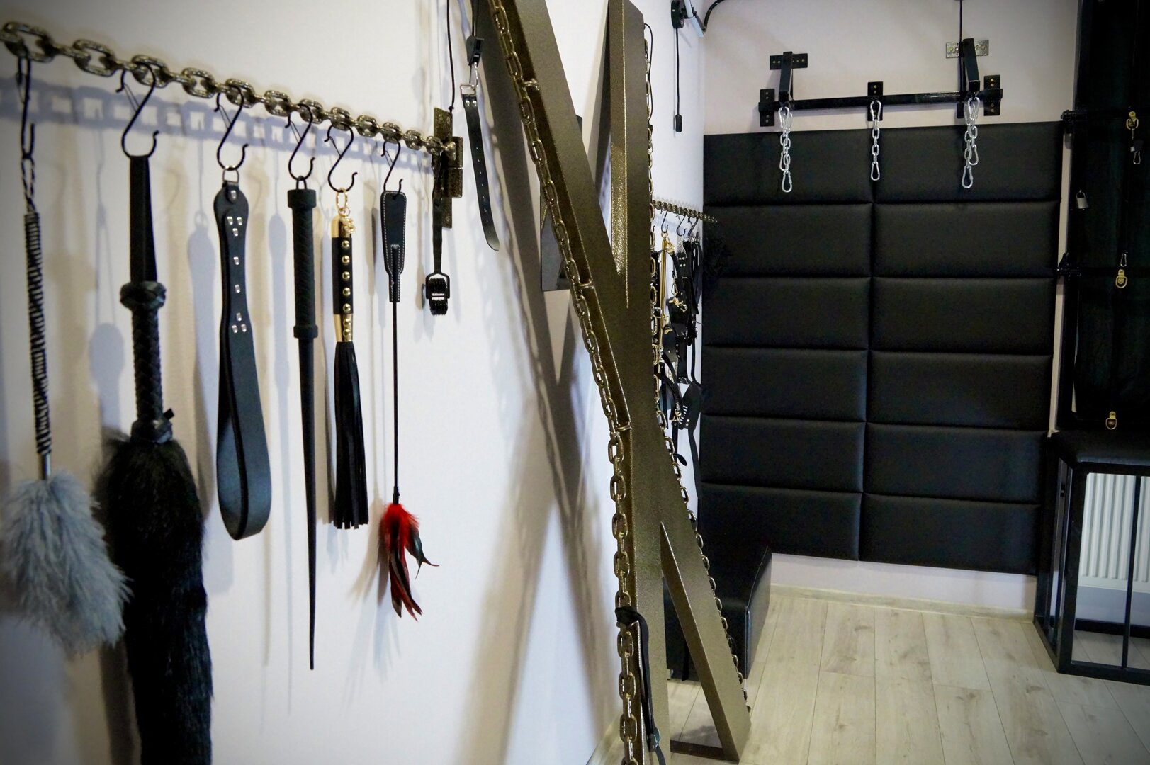 Najwięcej obiecuje playroom – stół do masażu połączony z klatką, fotel tantryczny, krzyż, maski, więzy i akcesoria. To miejsce, które inspiruje do eksplorowania siebie.
